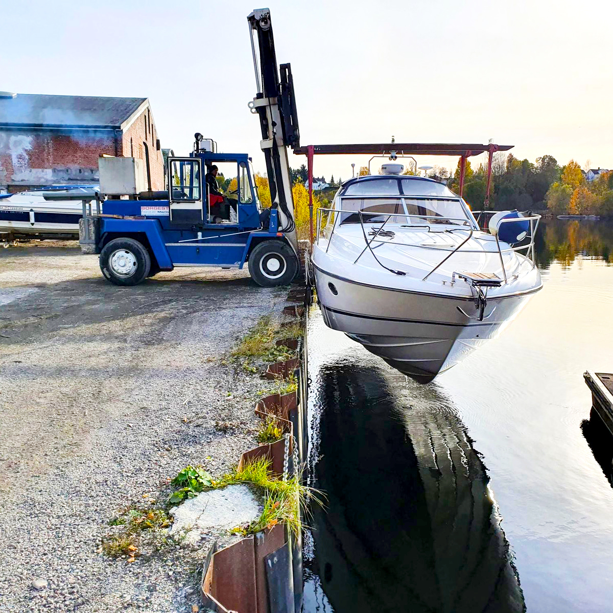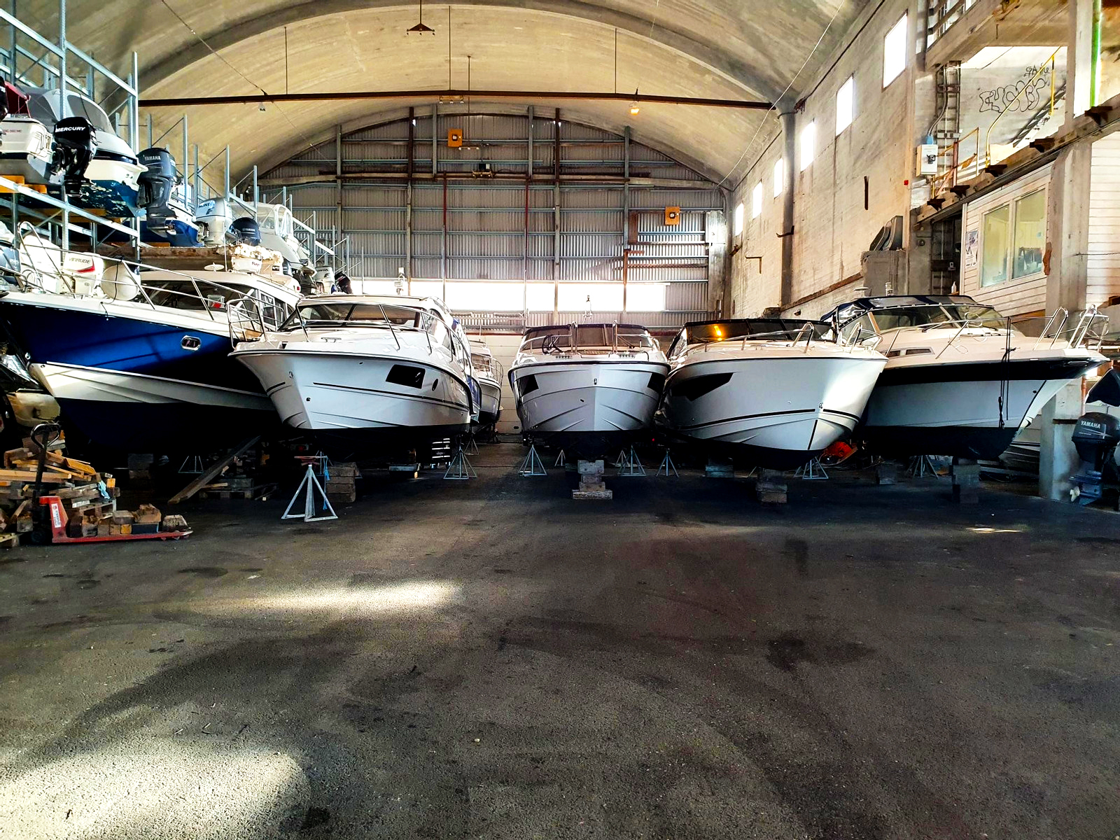 Innendørs tar vi båter opp til 42 fot / 8.5 tonn, vi kan løfte opp fra Telemarksvassdraget som ligger rett utenfor opplagsbygget på Borgestad.
